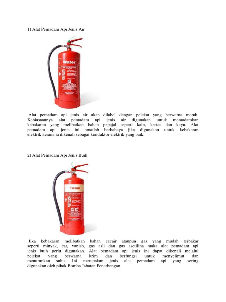 Alat Pemadam Docx from imgv2-2-f.scribdassets.com Gas co2akan menolak air keluar melalui discharge tube dan keluar melalui nozzle. Alat pemadam api ringan (apar) / tabung pemadam kebakaran sangat diperlukan untuk kebutuhan perusahaan/pabrik anda, disini kami sebagai perusahaan yang bergerak dibidang alat pemadam kebakaran menjual berbagai macam jenis peralatan dan perlengkapan alat pemadam. Alat pencegahan kebakaran mudah alih yang penting. Alat pemadam api (apar) jenis cairan/water. Air banyak digunakan sebagai media pemadam api karena mudah didapat dan murah tentunya. Alat pemadam api portable berdasarkan beratnya, alat pemadam portable atau sering disebut juga tabung pemadam dibedakan menjadi dua jenis yaitu alat pemadam api hydrant hydrant adalah titik koneksi air dengan petugas pemadam kebakaran agar dapat memanfaatkan sebuah pasokan air. Jenis alat pemadam api ini adalah untuk kelas d yang berkaitan dengan kebakaran logam yang mudah terbakar. Jenis media alat pemadam api.