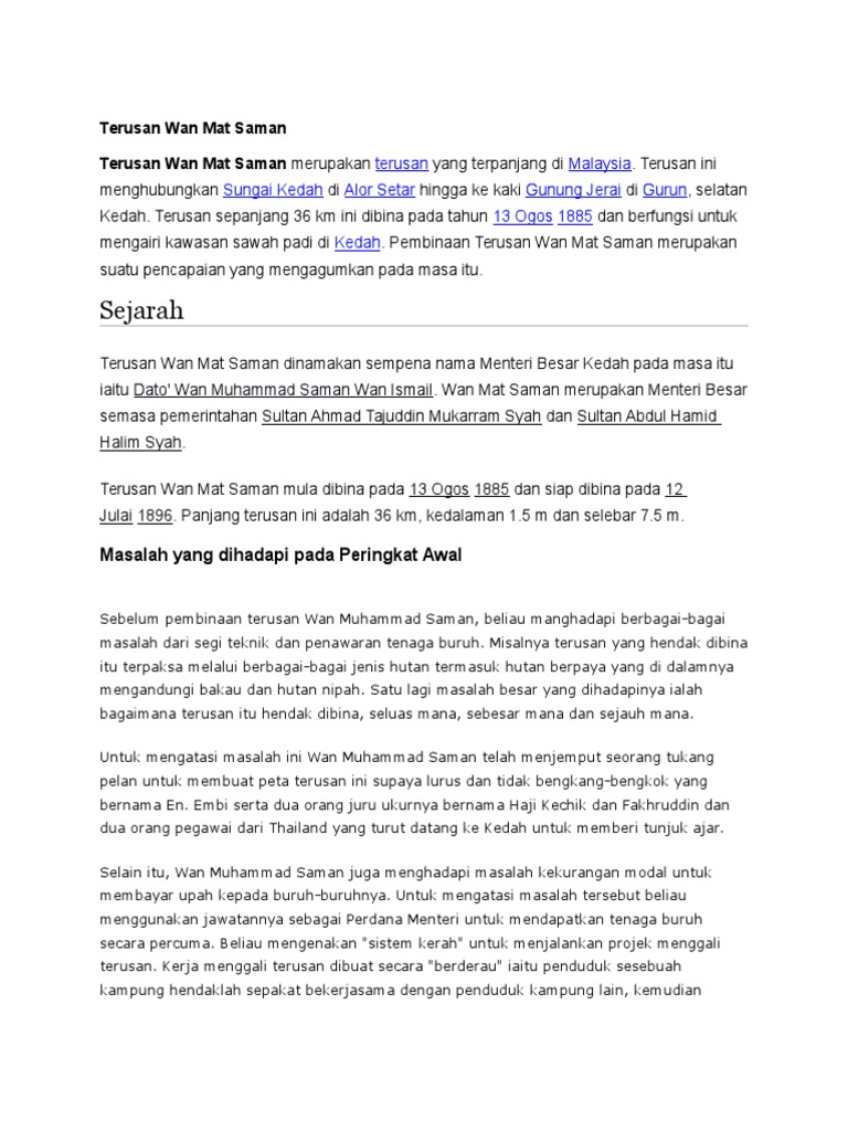 Ia dibina menggunakan 100 peratus kudrat manusia sekaligus menjadikannya terusan buatan manusia terpanjang di malaysia. Terusan wan mat saman merupakan satu projek pengairan yang telah menyumbang kepada pembangunan ekonomi negeri kedah pada abad ke 19. The structure enables kedah to boost its rice. Terusan wan mat saman is a canal in kedah and has an elevation of 4 metres. The total length is 36 km, connecting sungai kedah at alor star to gurun in the south of kedah.
