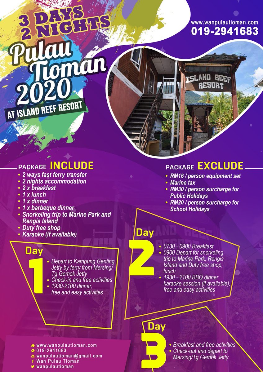 Pakej pulau tioman (original), kuala rompin. Untuk 3h2m harga warna pink tu untuk weekday yang bukan cuti sekolah sahaja yang kuning tu unt. Promosi atas talian terkini untuk pakej percutian tioman, jimat lebih banyak apabila anda menempah dengan holidaygogogo! Sebagai peneraju pakej bercuti ke pulau tioman terletak di negeri pahang ini, jauh di sanubaru saya ingin sekali menyediakan banyak perkara sebagai kepuasan pelancong. Panduan dan tarikan di kampung genting pulau tioman, pahang.