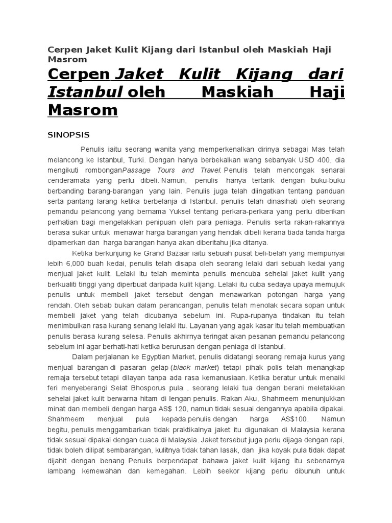 Pada akhir pembelajaran pelajar dapat : Beiau telah memperuntukkan sejumlah wang untuk berbelanja di turki. Jaket kulit kijang dari istanbul. Jaket kulit kijang dari istanbul (spm 2019). Jaket kulit kijang dari istanbul ( maskiah haji masrom ) sinopsis. 0 ratings0% found this document useful istanbul sinopsis (这个 cerpen 是一则真人真事的日记) 作者(主角),mas 带了 usd400,马币 rm1800 去 istanbul,turki 旅行(和朋友同 行)。 Sinopsis mengisahkan aku melancong ke negara turki sambil mencari cenderahati untuk di bawa pulang ke malaysia. Harga jaket kulit asli yg mahal. Dia berkunjung ke grand bazzaar yang mempunyai 6000 buah kedai. Mengapa perlu tahu cara mencuci jaket kulit dengan benar. Pada bondanya, 'saya' masih belum mantap bahasa ibunda dan jati dirinya. Antologi tingkatan 4 jaket kulit kijang dari istanbul animasi cerpen direka cipta oleh myteach sdn bhd produk. Tanpa harus pergi ke jasa profesional, simak berbagai hal yang perlu.